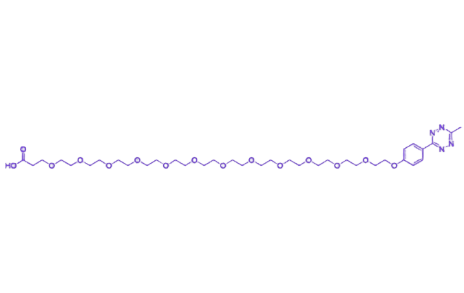 核心甲基四嗪(Methyltetrazine)基团赋予分子无需催化剂即可在生理环境下与反式环辛烯(TCO) 发生快速特异性反应的能力,为活体生物分子标记、细胞内动态过程追踪等前沿研究提供高效化学工具。聚乙二醇12(PEG12)链段的引入显著提升分子亲水性与空间位阻,有效减少非特异性吸附并增强生物相容性,有助于延长其在体内的循环半衰期。末端羧基(-COOH) 作为多功能修饰位点,可通过缩合反应与含氨基、羟基的生物分子、纳米材料或药物分子稳定偶联,拓展其在复杂体系中的应用场景。