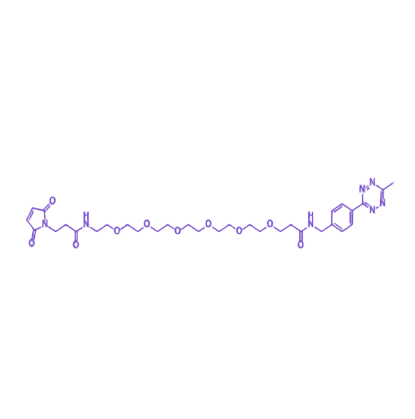 该试剂分子式为C32H45N7O10,标准纯度不低于95%。核心功能基团中,甲基四嗪基团可与反环辛烯(TCO)发生高效无铜点击反应,具有特异性强、反应速率快的特点,适配复杂生物体系;马来酰亚胺基团能与生物分子的游离巯基(-SH)特异性结合,形成稳定硫醚键,实现定点偶联。中间的PEG6长链作为性能核心,相比短链PEG,其水溶性、生物相容性更优,可明显延长分子体内循环时间、降低免疫原性,同时提供充足柔性与空间长度,减少分子间聚集。