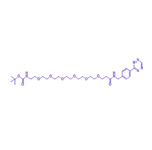分子结构中,四嗪基团作为核心反应单元,可与反环辛烯(TCO)发生逆电子需求Diels-Alder反应(iEDDA),该反应具有特异性强、反应速率快的特点,能够在复杂生物环境中实现精准偶联。中间连接的PEG6长链相较于短链PEG衍生物,显著提升了试剂的水溶性与生物相容性,可有效降低免疫原性及蛋白非特异性吸附,延长偶联产物的体内循环时间;同时,柔性链段提供充足的空间位阻,减少分子间聚集现象,保障偶联效率与产物稳定性。末端修饰的Boc(叔丁氧羰基)保护氨基赋予反应过程可控性,通过酸性条件(如三氟乙酸/TFA体系)脱保护后可暴露游离氨基,用于后续靶向分子或功能基团的二次官能化,实现“分步可控”的精准修饰策略。