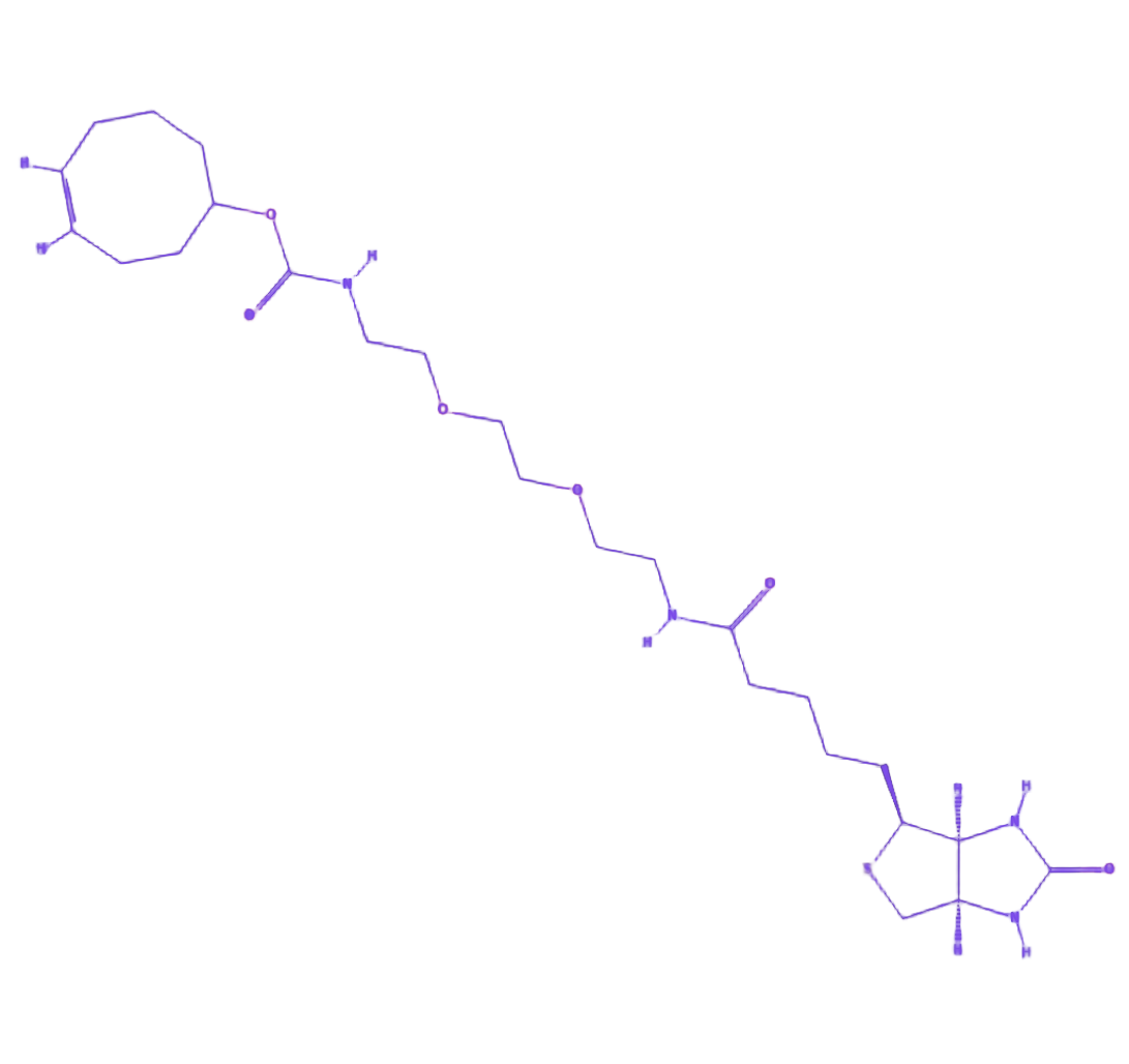 在应用场景中,该化合物是复杂体系蛋白质亲和纯化的优选工具,通过 TCO-四嗪反应实现蛋白质快速生物素化,链霉亲和素磁珠分离纯度高;在免疫分析领域可高效标记抗体,提升 ELISA 检测灵敏度;在活细胞成像中能准确靶向标记含四嗪的生物分子,实现长时间动态追踪。储存时需密封置于-20℃避光干燥环境,避免高温、强光与过度潮湿,粉末状态下保质期可达 12 个月,溶解后建议 48 小时内使用以维持较佳活性。