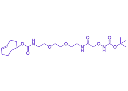 其分子结构包含三个关键功能单元:反式环辛烯(TCO)基团作为核心反应位点,能与四嗪(Tetrazine)类化合物在生理条件下发生无需催化剂的快速生物正交反应,该特性使其适用于活体生物分子标记、细胞表面修饰等动态生物体系研究。叔丁氧羰基(Boc)保护的氨氧基基团则提供了可控反应性,在常规储存与操作条件下保持化学稳定性,避免氨氧基过早参与反应;当需要激活时,可通过酸性条件(如三氟乙酸处理)高效脱去 Boc 保护基,释放的氨氧基能与含醛基或酮基的生物分子特异性结合,形成稳定的肟键或腙键,确保生物分子修饰的准确性与靶向性。聚乙二醇 2(PEG2)链段的引入赋予分子适度亲水性与空间位阻效应,可有效降低非特异性吸附,提升生物相容性,减少背景干扰。