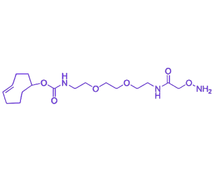 结构中的 反式环辛烯(TCO)基团 可与四嗪(Tetrazine)类化合物发生快速生物正交反应,该反应无需催化剂即可在生理条件下高效进行,为生物分子的原位标记提供了优异的时间分辨能力。 氨氧基(Aminooxy)官能团 能够与含醛基或酮基的生物分子在温和条件下发生特异性反应,形成稳定的肟键或腙键,确保生物分子修饰与偶联的高选择性和准确性。 聚乙二醇 2(PEG2)链段 赋予分子适度的亲水性和空间位阻效应,有效降低非特异性吸附,显著增强生物相容性,提升试剂在复杂生物体系中的稳定性与靶向性。