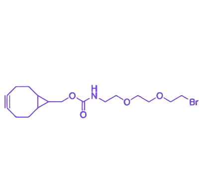 环丙烷环辛炔(BCN)基团具备无铜点击化学活性,可在温和条件下与叠氮基发生特异性环加成反应,无需铜催化剂即可完成复杂生物体系中的精准分子连接,适用于活体生物分子标记、体内成像等场景。氨基甲酸酯作为稳定连接单元,显著提升分子化学稳定性,同时为结构引入适度极性,优化整体理化性质。二聚乙二醇(PEG2)链段赋予分子优异的亲水性与柔韧性,能有效减少非特异性吸附,增强生物相容性,并延长分子在体内的循环时间。末端溴化物作为活泼离去基团,在碱性条件或亲核试剂存在下,可与胺基、巯基等发生亲核取代反应,实现与蛋白质、多肽、核酸等生物分子的高效偶联。