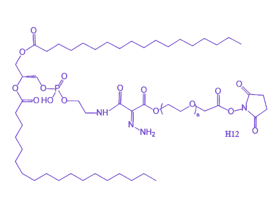 DSPE-Hyd-PEG-NHS-H12 是一种多组分功能化生物活性材料,其分子结构整合了疏水性磷脂、pH 敏感键、亲水性聚合物、反应活性基团及功能性多肽,通过协同作用实现材料在生物医学领域的靶向递送与可控释放。