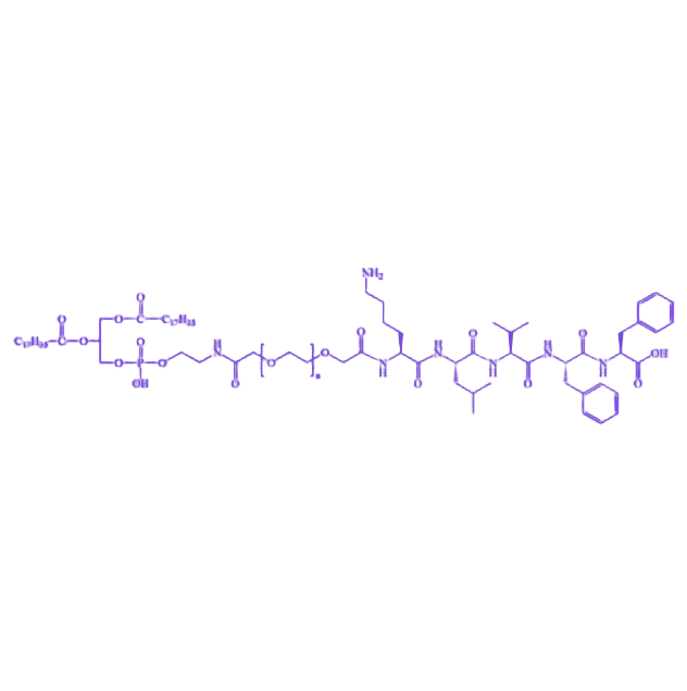 DSPE-PEG-KLVFF 是一种由磷脂、聚合物链与靶向肽段共价连接形成的功能性化合物,兼具脂质膜相互作用能力、水溶性调节特性及β-淀粉样蛋白(Aβ)靶向识别功能,在纳米药物递送系统构建中具有潜在应用价值。