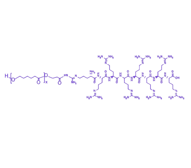 聚己内酯-八聚精氨酸是一种由生物相容性聚合物与细胞穿透肽偶联形成的功能性材料,兼具载体稳定性与高效细胞递送能力,在生物医学领域具有重要应用潜力。 该材料的主体结构由聚己内酯(PCL)与八聚精氨酸(R8)通过共价键连接构成。其中,PCL组分由ε-己内酯单体经催化开环聚合反应合成,其分子链的结晶性结构赋予材料对疏水性物质的优异包裹能力,可作为药物递送系统的载体骨架。作为可降解高分子材料,PCL在生理环境中能通过酶解或微生物降解途径逐步分解,最终代谢为二氧化碳和水,展现出良好的生物安全性和环境相容性。 材料中的八聚精氨酸组分是由8个精氨酸残基串联形成的典型细胞穿透肽,其分子结构中的胍基基团赋予强正电荷特性。该特性使其能与带负电的细胞膜磷脂双分子层发生静电相互作用,通过内吞等机制促进偶联物高效穿透细胞膜,实现负载物质向细胞内的递送。这种协同效应使聚己内酯-八聚精氨酸在构建靶向给药系统、基因递送载体等领域具有独特优势,为提高生物活性分子的细胞内转运效率提供了新的解决方案。