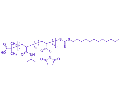 P(NIPAM-co-NAS)是一种整合温度响应性与高反应活性的功能性无规共聚物,通过N-异丙基丙烯酰胺(NIPAM)与N-丙烯酰氧琥珀酰亚胺(NAS)单体共聚制得,兼具聚(N-异丙基丙烯酰胺)(PNIPAM)的温敏特性与聚(N-丙烯酰氧琥珀酰亚胺)(PNAS)的反应活性,是生物偶联、智能药物载体等领域的通用平台型聚合物。 该共聚物的温度响应性源于PNIPAM链段,使其在水溶液中呈现约32°C的较低临界溶解温度(LCST),可通过温度调控实现亲水-疏水特性的可逆转变。其反应活性则依赖PNAS链段中的琥珀酰亚胺酯基团,该活性酯能在温和条件(水相/有机相、中性/弱碱性环境)下与伯氨基(-NH₂)快速发生酰胺化反应,同时释放N-羟基琥珀酰亚胺(NHS),为功能分子的共价偶联提供高效反应位点。 通过调节NIPAM与NAS的单体投料比,可精准平衡共聚物的温敏性能与反应位点密度。采用可控自由基聚合技术合成,产品分子量分布(PDI)通常小于1.5,确保结构均一性与批次稳定性。该共聚物可通过琥珀酰亚胺酯-氨基偶联反应,在分子骨架上键合荧光染料、生物靶向配体(如RGD肽、叶酸)、药物分子或其他聚合物,拓展功能多样性。 在应用领域,P(NIPAM-co-NAS)凭借温度响应性与可修饰性,在生物偶联反应中实现精准分子组装,在智能药物载体设计中构建温度响应型释药系统,在功能化表面修饰中调控界面亲疏水性,在生物传感器开发中提升检测灵敏度,展现出在生物医用材料、智能高分子材料及分析化学等领域的重要应用价值。