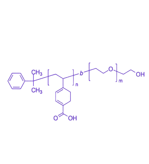 P(VBA)-b-PEO是由4-乙烯基苯甲醛(VBA)与聚乙二醇(PEO)构成的嵌段共聚物,其核心优势在于VBA片段的高反应性与PEO链段的亲水性、生物相容性的协同作用,赋予材料自组装行为与功能化潜力,在功能高分子及生物医用领域具有重要应用价值。 VBA片段通过携带的苯甲醛基团提供关键反应位点,可参与Schiff碱反应、缩合反应,并能与多胺、多肽等生物分子实现可逆化学结合,为材料功能化修饰奠定基础。同时,VBA段的疏水性使其在自组装过程中倾向于形成结构内核,而醛基的存在进一步赋予疏水核表面可修饰特性,可通过原位Schiff碱反应引入功能性官能团,调控纳米结构的稳定性或赋予pH等环境响应特性。 PEO片段作为经典亲水性软段,赋予共聚物良好的水分散性、低蛋白吸附性及温和界面行为,其稳定且柔性的链段结构可提升材料的溶解性、加工性与整体稳定性。由于VBA与PEO区段存在显著的物性差异,该共聚物表现出明显的微相分离行为,在溶液中可自组装形成胶束、囊泡或核-壳纳米结构;在水中,VBA段聚集形成疏水核,PEO段向外伸展形成溶剂化壳层,构建粒径均匀的纳米微粒,且得益于两嵌段的热力学相容性,自组装行为在不同溶剂中均展现良好稳定性。 基于上述特性,P(VBA)-b-PEO在界面改性、传感材料构建、可控交联体系等领域具有独特应用潜力,其动态键合能力与结构可调控性为构建响应性智能材料提供了灵活的分子设计平台,尤其在功能高分子化学、软物质材料及表面工程领域展现出较高的应用灵活度。