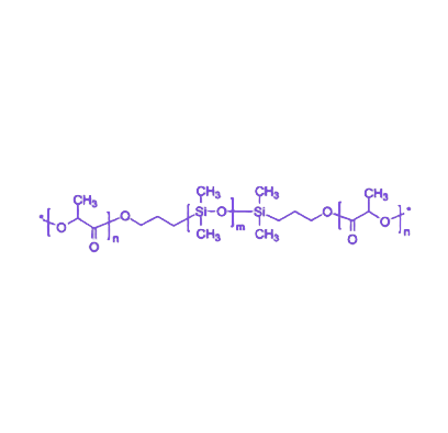 Poly(lactide)-b-poly(dimethyl siloxane)-b-poly(lactide) (PLA-b-PDMS-b-PLA) 是一种创新性 生物可降解三嵌段共聚物,通过将刚性可降解聚酯与柔性生物稳定有机硅特性结合,形成"可降解-稳定-可降解"的三明治结构。该材料以生物相容性良好的聚(二甲基硅氧烷)(PDMS)为中间嵌段,两侧对称连接可生物降解的聚丙交酯(PLA)嵌段,在微观尺度呈现明显微相分离,形成以PDMS为连续相、PLA为分散相的纳米结构,兼具PDMS的持久弹性与PLA的可降解特性,为生物医学领域提供多功能材料平台。