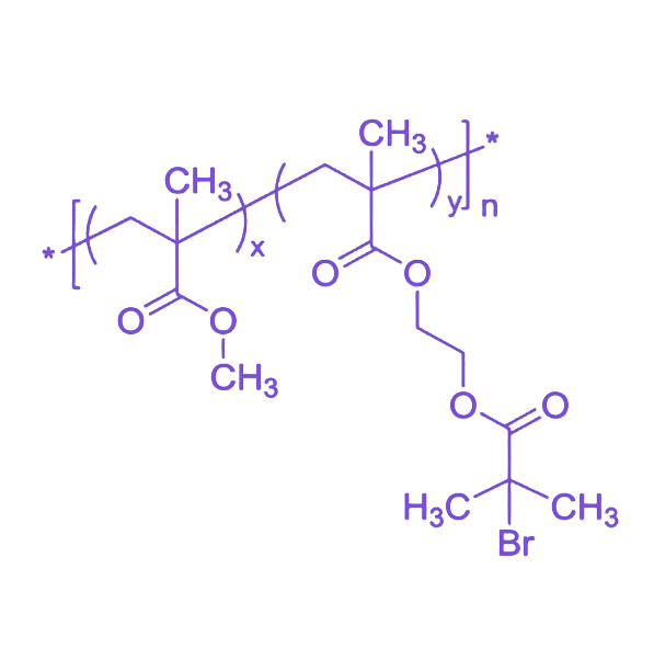 该共聚物由MMA与BIEM通过随机共聚制备,其中MMA链段贡献坚固主链结构、优异透明性及成膜性,BIEM单元则通过含有的活性溴原子作为原子转移自由基聚合(ATRP)引发位点,支持后续接枝或链增长反应。随机分布的BIEM单元确保材料在保留机械强度的同时,具备精确可控的功能化能力,可通过调节MMA与BIEM的比例、分子量及链段分布实现性能调控。