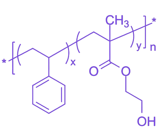 该共聚物的分子结构设计实现了性能的巧妙平衡:苯乙烯单元作为疏水组分,赋予材料力学强度、刚性、热稳定性和良好的成膜性;甲基丙烯酸-2-羟乙酯单元则提供亲水性、生物相容性和反应活性,其侧链羟乙基(-CH₂CH₂OH)作为柔性亲水基团,可通过氢键结合水分子赋予材料吸湿性,同时作为伯羟基反应位点参与酯化、醚化等化学反应。