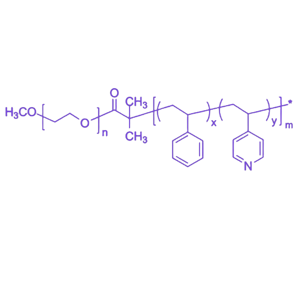 PEO-PS4VP(Poly(ethylene oxide)-block-Poly(4-vinylpyridine))是由亲水性聚乙二醇(PEO)与可调节极性的聚4-乙烯基吡啶(PS4VP)通过线性嵌段共聚形成的典型两嵌段共聚物,其分子链结构中PEO段形成水溶性外层,PS4VP段形成可调节极性核心。该材料在纳米自组装、智能材料、药物载体及功能膜材料领域具有重要应用价值,通过调控嵌段比例、分子量及溶液条件(如pH、盐浓度)可实现自组装行为的精准设计,展现出高度可控性。 PEO-PS4VP的核心特性在于其双嵌段结构赋予的协同功能。PEO段提供优异的水溶性和生物相容性,确保材料在水性环境中的稳定分散及生物安全性;PS4VP段则具备多重响应调节机制,可通过质子化改变亲水性,或与酸性分子、金属离子形成静电相互作用及配位键,从而实现对胶束形态、尺寸及表面性质的动态调控。这种环境响应特性(对pH、金属离子、离子强度敏感)使其成为构建智能响应系统的理想选择。 在制备方法上,PEO-PS4VP通常采用原子转移自由基聚合(ATRP) 或可逆加成-断裂链转移聚合(RAFT) 等可控聚合技术,可精确控制分子量分布和嵌段比例,保证材料性能的批次稳定性。通过对PS4VP段进行质子化处理、化学修饰或金属配位等功能化手段,能够进一步拓展材料的响应模式和应用场景,例如调控药物释放动力学或赋予材料催化、传感功能。 该材料的自组装行为具有高度可设计性,在水或有机溶剂中可自组装形成包括胶束、囊泡、薄膜等多种纳米结构。在药物递送领域,其胶束核心能高效包载疏水药物,PEO外层则通过空间位阻效应赋予材料抗蛋白吸附能力,延长体内循环时间,结合PS4VP段的pH响应性可实现药物在特定病灶部位的靶向释放。在膜技术方面,PEO-PS4VP可构建具有离子选择性的功能膜,在水处理及物质分离过程中展现出潜在应用价值。此外,通过与金属离子的配位作用,该材料还可用于制备高性能催化材料或化学传感器,在环境监测与绿色化学领域具有广阔前景。