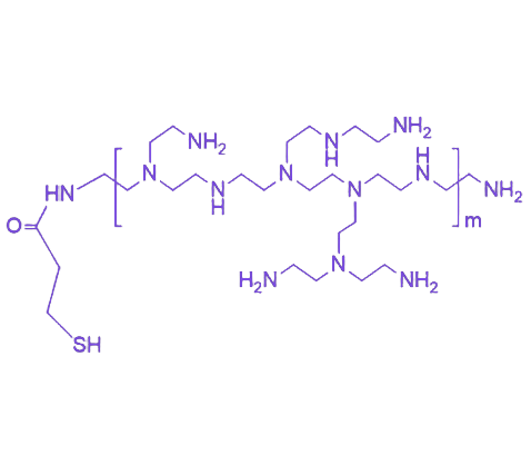 PEI-SH 是通过对聚乙烯亚胺(PEI)进行 巯基(-SH)修饰得到的功能性衍生物,其设计旨在平衡材料的生物相容性与反应活性,同时保留 PEI 对生物大分子的结合能力并增强结构可设计性,以满足不同生物医学场景的应用需求。