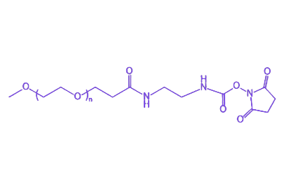 mPEG-SC作为一类重要的聚乙二醇衍生物,通过将甲氧基聚乙二醇的亲水性与生物相容性优势,与琥珀酰亚胺碳酸酯基团的高反应活性相结合,在生物医学领域展现出关键应用价值。其结构设计使其既能有效降低生物体内的免疫原性、延长循环时间并提升分散性,又能通过特异性共价偶联反应实现对生物分子、药物及生物材料的精准修饰与功能化。