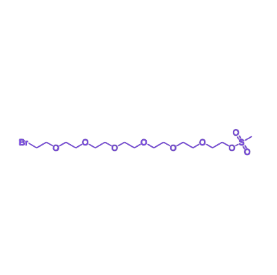 该产品常温下呈无色至淡黄色透明黏稠液体,易溶于DCM、THF、DMF等有机溶剂,水溶性与Br-PEG6-Ms持平,可与水按任意体积比稳定混溶,溶液抗分层能力强,兼具良好的化学稳定性与双官能团反应活性。分子结构中,溴代基团甲磺酰基为高活性离去基团,可分步参与亲核取代反应,七聚PEG链段能引入更长柔性醚键连接臂,为分子设计提供灵活的空间 linker 选择。