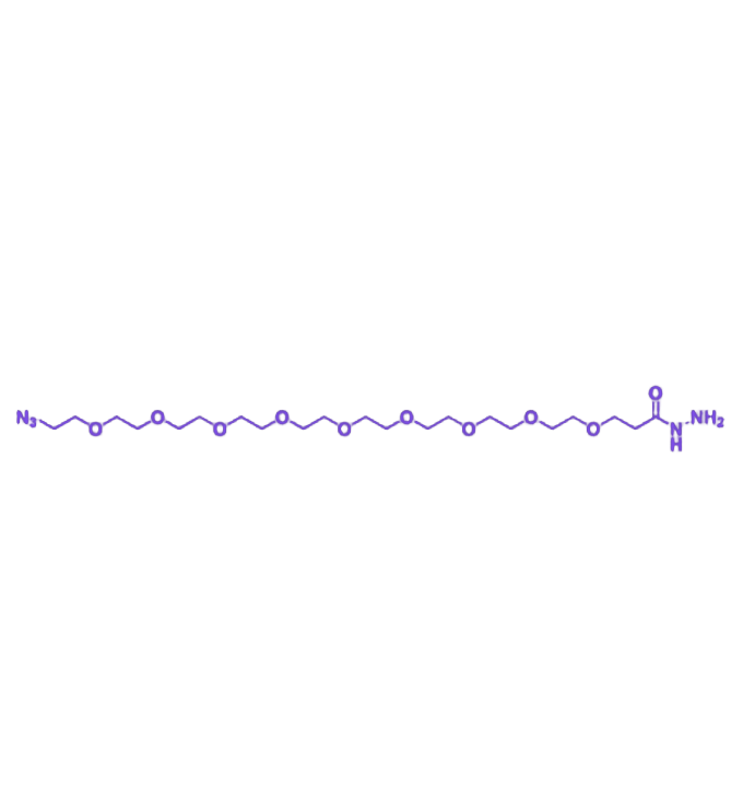 叠氮端基可通过铜催化点击反应(CuAAC)或无铜点击反应(SPAAC)与炔基化分子(如炔修饰蛋白质、小分子探针或纳米载体表面)高效连接,形成稳定三唑环结构;酰肼基则能与醛/酮基化合物发生可逆缩合反应生成腙键,实现pH响应型或氧化还原响应型动态偶联。PEG9链段提供的空间柔性和溶剂兼容性,可显著减少非特异吸附并提升生物体系稳定性。