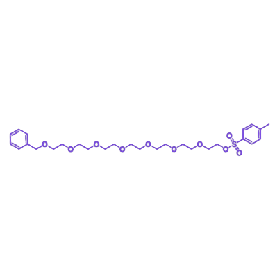 分子结构包含三个关键部分:苄基通过稳定的醚键连接在 PEG 链一端,作为保护基团提供惰性疏水端,可通过催化氢化选择性脱除并暴露出羟基;中间 PEG7 链段含 7 个乙二醇单元,提供亲水性、柔性和水溶性,同时作为 spacer 减小空间位阻;末端对甲苯磺酸酯基团(-OTs)为亲电试剂和离去基团,能与伯胺、仲胺、醇盐、硫醇盐等多种亲核试剂在温和条件下(通常需碱催化)发生取代反应,将苄基-PEG 链段连接到目标分子上,形成稳定的醚、胺或硫醚键。该化合物常用于制备 PEG 交联剂、PEG 化药物或生物分子,在医药化学和材料科学领域具有重要应用价值。