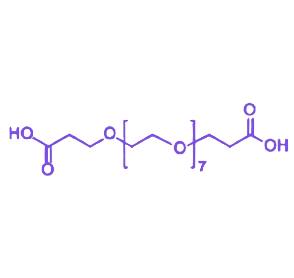该产品分子结构呈现明确的对称性,两端为活性羧基(-COOH)基团,中间通过七聚乙二醇(PEG7)链段连接,形成“羧基-PEG 链-羧基”的线性分子架构。两端羧基可在 EDC/NHS、DCC 等缩合剂作用下被活化,进而与氨基或羟基发生 酰胺化酯化反应,反应条件温和,在中性至弱碱性室温环境下即可进行,能有效保留生物分子的活性,满足多样化的功能化修饰需求。
