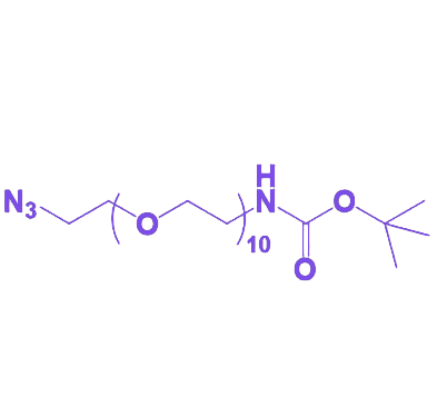 <strong>核心结构与协同效应</strong>:分子由叠氮基团、十聚乙二醇间隔臂(含10个氧乙烯单元,分子长度约33 Å)及叔丁氧羰基保护氨基构成,通过双活性位点的正交反应特性与PEG链的亲水、空间缓冲、体内长效、抗蛋白吸附、复杂载体兼容、深度渗透、极端耐受、多场景适配、性能强化九重效应协同,实现高效精准的分子偶联与功能强化。