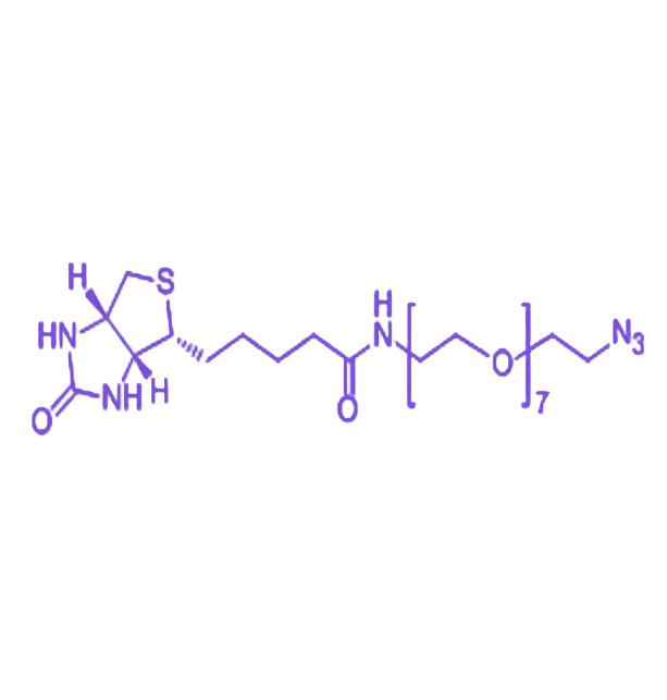 Biotin-PEG7-N3 是一种由生物素、7 个重复单元的聚乙二醇(PEG7)链段及叠氮基团(N3)组成的功能性聚乙二醇衍生物,具备生物分子特异性识别、优异的水溶性与生物相容性,以及高效的化学偶联能力,在生物医学研究领域具有广泛应用价值。 该分子的核心结构包含三个关键功能模块:生物素作为靶向识别单元,可与链霉亲和素或卵白素形成自然界最强的非共价键结合之一,为生物分子标记、分离与检测提供高特异性识别基础;PEG7 链段作为连接臂,显著提升分子的水溶性与生物相容性,有效降低免疫原性及非特异性吸附,同时增强水相环境中的操作稳定性与便捷性;叠氮基团(N3)作为反应活性位点,可在温和条件下通过铜催化的点击化学(CuAAC)或无金属催化的应变促进炔叠氮环加成反应(SPAAC),与炔基高效偶联生成稳定的 1,2,3-三唑结构,实现分子的精准定向修饰。 基于上述特性,该化合物可用于蛋白质、核酸等生物大分子的定点修饰,构建生物素化分子探针,实现对目标生物分子的高灵敏度追踪与可视化分析;在药物递送系统研究中,借助生物素-亲和素的特异性相互作用,可实现药物向特定细胞或组织的靶向递送,提升药物的治疗效果并降低毒副作用;此外,在生物材料表面功能化修饰、细胞标记与活体成像等领域,其独特的结构设计也展现出显著的应用潜力。