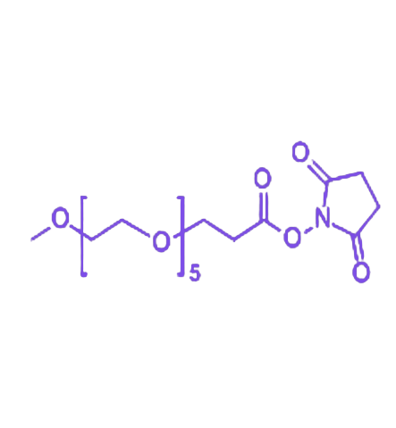 该化合物的分子结构由三部分构成:一端为化学性质稳定的甲氧基(-OCH₃),可有效避免储存及反应过程中的非特异性副反应;中间链段由5个乙二醇单元组成,赋予分子优异的亲水性,使其可溶于水及 DMSO、DMF 等极性有机溶剂;另一端的琥珀酰亚胺丙酸酯(SPA)基团作为核心活性位点,能够与蛋白质、多肽等生物大分子的氨基发生特异性共价结合。