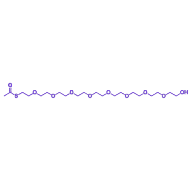 其核心结构包含乙酰硫基(AcS-)、聚乙二醇9(PEG9)间隔臂与羟基(-OH) 三个关键功能单元。乙酰硫基作为巯基(-SH)的保护基团,可在极温和条件(如0.05 mol/L氨水、1%-3%硫代乙醇胺溶液)下实现精准脱保护,释放游离巯基的同时有效避免巯基氧化团聚,且对单克隆抗体、核酸药物载体等超敏感生物分子无损伤。羟基则可通过酯化、醚化、缩合等反应与羧基、卤代烃、异氰酸酯等基团结合,支持双位点分步可控修饰。