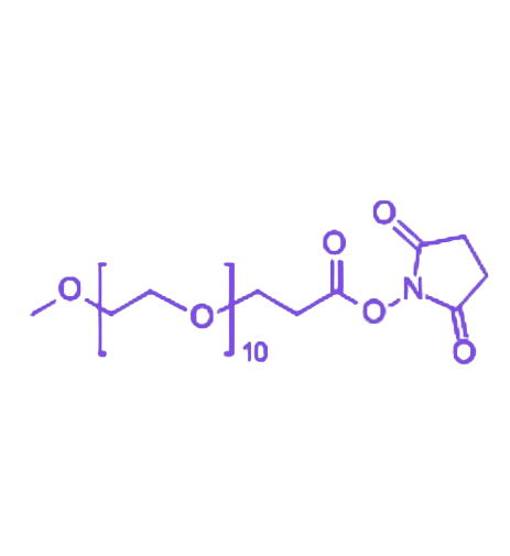 mPEG10-SPA(甲氧基聚乙二醇 10 琥珀酰亚胺丙酸酯)是一类具有明确分子结构与高生物活性的聚乙二醇衍生物,其通过精准的化学设计实现了结构稳定性与功能靶向性的有机统一,在生物医学及材料科学领域展现出重要应用价值。该分子由三部分核心结构单元构成:一端为化学惰性的甲氧基(-OCH₃),可有效抑制储存及反应过程中的非特异性副反应,保障分子结构完整性;中间链段由10个乙二醇单元有序连接形成亲水性PEG骨架,赋予分子优异的溶解性能,不仅可完全溶于水,还能在DMSO、DMF、乙腈等极性有机溶剂中实现均匀分散;另一端修饰的琥珀酰亚胺丙酸酯(SPA)基团为关键活性位点,具备与含氨基生物大分子(如蛋白质、多肽)发生特异性共价偶联的能力,通过酰胺键形成稳定连接。
