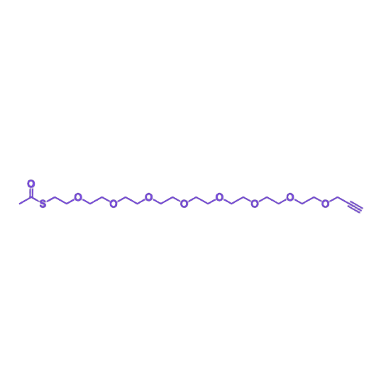 该分子的PEG链段为其提供核心理化基础,赋予分子优异的水溶性生物相容性,可有效提升缀合分子在生物环境中的分散性与稳定性。乙酰硫酸基团(AcS)进一步强化水溶性,同时作为活性位点参与分子间相互作用,增强与药物分子或载体的共价结合能力。丙炔基团(propargyl)作为关键反应单元,可通过点击化学反应(如与叠氮基、硫醇基团的特异性偶联)形成稳定共价键,为靶向修饰与功能化偶联提供高效化学手段。