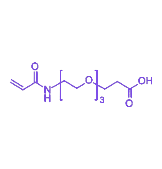 分子结构特征:分子两端分别为 ACA(Acryloyl group)与羧基(–COOH),中间由四个乙二醇单元(PEG4)构成。ACA 端基具备可聚合或光交联活性,可参与自由基聚合反应,或通过 Michael 加成与巯基(–SH)形成稳定键合;COOH 端基可经 EDC/NHS 等活化方式与氨基偶联,生成酰胺键。PEG4 链段作为亲水性桥接单元,提供柔性空间以减少反应空间位阻,并保障产物在水相及有机相中的良好溶解性。
