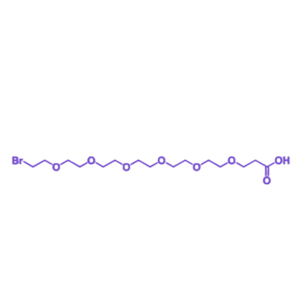 分子结构由线性 PEG6 链段(约含6个乙二醇重复单元)与两端功能基团构成,一端为 溴基(-Br),另一端为 羧酸基(-COOH)。较 PEG5 更长的链段赋予分子更优异的 柔性 和亲水性,在溶液中可形成稳固水化层,提升溶解度与生物相容性。