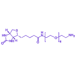 Biotin-PEG6-NH2 是一种双功能活性中链聚乙二醇衍生物,呈“生物素-PEG链-氨基”线性结构,兼具靶向识别与化学修饰功能,其六聚乙二醇链段赋予分子优异的亲水性、生物相容性及空间缓冲能力,适用于生物医学靶向研究及材料表面功能化修饰。 该分子一端的生物素基团可与亲和素、链霉亲和素发生特异性极高且稳定的结合,解离常数 Kd 约为 10⁻¹⁵M,为生物分子的靶向识别、富集和检测提供准确作用基础。另一端的氨基(-NH₂)化学性质活泼,能与羧基、醛基、活性酯等发生化学反应,形成稳定化学键,实现生物分子或材料表面的功能化修饰。 相较于 Biotin-PEG5-NH2,中间的六聚乙二醇(PEG6)链段进一步提升了亲水性和空间伸展性,可增强修饰后分子的水溶性和生物相容性,降低免疫原性和非特异性吸附。同时,更长的链长能构建更有效的空间缓冲层,减少空间位阻对生物素-亲和素结合及氨基反应的影响,使分子在复杂生物环境中具备更高的稳定性和反应灵活性。