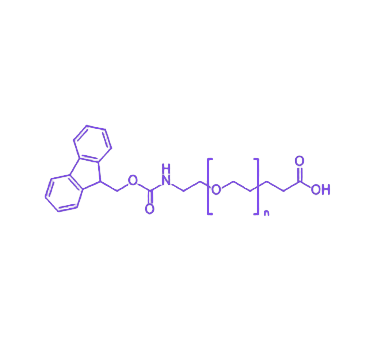 分子结构中,一端为芴甲氧羰基(Fmoc)保护基,该基团能有效屏蔽相连氨基在复杂化学反应中的副反应风险,且可在温和碱性条件(如20%哌啶的N,N-二甲基甲酰胺溶液)下实现高效脱保护,使氨基恢复反应活性,为后续的多肽合成与生物偶联提供精准可控的反应位点。中间链段为聚乙二醇(PEG),其卓越的亲水性赋予分子良好的水溶性,同时显著提升生物相容性,降低在生物体内的免疫原性,是药物载体和生物材料表面改性的理想选择。分子另一端的羧基(-COOH)作为关键活性基团,在EDC、DCC等活化剂介导下,可与含伯胺基的生物分子(如蛋白质、抗体、核酸衍生物)高效偶联,形成稳定的酰胺键,为构建复杂生物功能结构提供可靠的化学连接。