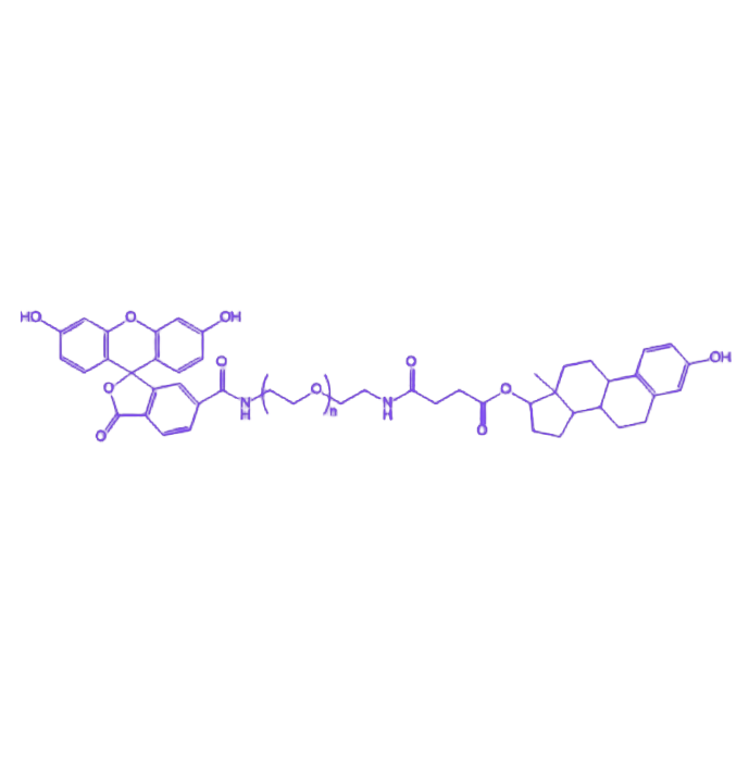 FITC-PEG-Estrogen是一种由异硫氰基荧光素(FITC)、聚乙二醇(PEG)与雌激素通过化学偶联形成的功能性生物分子探针,兼具荧光示踪特性、生物相容性提升及靶向结合能力,适用于生物医学研究中的分子标记与细胞成像等场景。 < strong >异硫氰基荧光素(FITC) 作为核心荧光标记单元,具有约490nm的激发波长和515-525nm的绿色荧光发射特性,可通过荧光显微镜、流式细胞仪等设备精准捕捉荧光信号,实现目标分子的可视化追踪。其活性基团异硫氰酸酯(-NCS)能与生物分子中的氨基(-NH₂)发生特异性共价反应,确保标记过程的稳定性与靶向性。 < strong >聚乙二醇(PEG) 链段赋予分子优异的亲水性,显著提升水溶性并降低免疫原性,同时减少非特异性吸附以增强生物相容性,延长体内循环时间。作为柔性连接臂,PEG可有效降低FITC与雌激素之间的空间位阻效应,优化分子整体构象,确保各功能单元的生物学活性得以充分发挥。 雌激素作为靶向结合模块,赋予分子与雌激素受体的特异性识别能力,为研究雌激素相关生理过程、受体结合动力学及药物递送系统提供了工具基础,在细胞生物学、药理学及分子影像学研究中具有潜在应用价值。