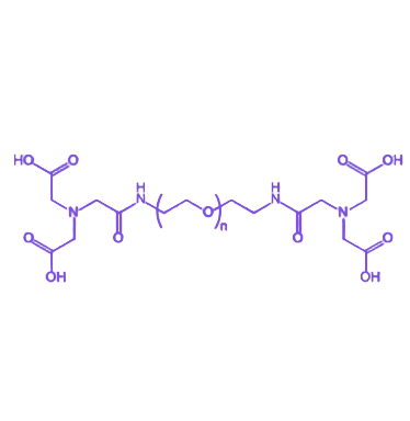 NTA-PEG-NTA(次氮基三乙酸-聚乙二醇-次氮基三乙酸)是一类具有双端功能化结构的生物医用高分子材料,通过聚乙二醇(PEG)主链连接两个次氮基三乙酸(NTA)基团,兼具靶向配位能力与生物相容性。该产品在生物分离、蛋白质固定及生物传感等领域展现出独特应用价值。 该化合物分子结构中,PEG链段赋予其优异的水溶性和生物惰性,可有效减少非特异性吸附;两端的次氮基三乙酸(NTA)基团则通过与过渡金属离子(如Ni²⁺、Cu²⁺)形成稳定螯合物,实现对组氨酸标签(His-tag)蛋白的高选择性识别与捕获。其物化性质表现为良好的热稳定性和pH响应性,在生理条件下可保持结构完整性,同时通过调节PEG分子量(常见范围500-20000 Da)可灵活调控材料的亲水性与空间位阻效应。在应用层面,该产品可作为高效亲和配体用于蛋白质纯化色谱填料的表面修饰,或作为生物探针载体构建高灵敏度检测平台,尤其在单分子水平的蛋白质相互作用研究中具有显著优势。