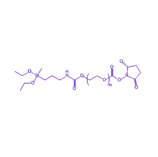 该化合物分子结构中,一端为可水解的二乙氧基硅烷基团,能够与无机材料(如二氧化硅、玻璃、金属氧化物等)表面的羟基发生缩合反应,实现材料界面的共价修饰;另一端的琥珀酰亚胺碳酸酯基团则可与含氨基(-NH₂)的生物分子(如蛋白质、肽、抗体等)发生高效的氨解反应,形成稳定的共价键。PEG链段的引入不仅能有效改善材料的亲水性,还可减少非特异性吸附,提升生物相容性。其物化性质表现为良好的溶解性能,可溶于水及多种有机溶剂,分子量可根据需求定制,为不同应用场景提供灵活选择。在生物医学工程领域,该产品可用于制备生物功能化涂层、构建靶向给药系统、修饰生物传感器表面等,为实现材料与生物体的高效、稳定结合提供关键技术支撑。