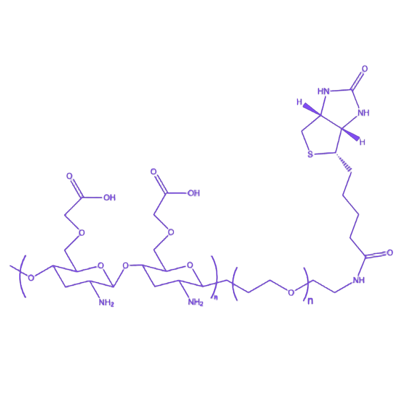 CMCS-PEG-biotin(羧甲基壳聚糖-聚乙二醇-生物素)是一种通过化学偶联技术制备的多功能生物医用复合材料,兼具天然高分子的生物相容性与合成聚合物的结构可调控性。该材料通过精准的分子设计实现了羧甲基壳聚糖主链与生物素靶向基团的高效连接,为生物活性分子固定化及靶向递送提供了理想载体。 该产品分子结构以羧甲基壳聚糖(CMCS)为亲水骨架,通过聚乙二醇(PEG)柔性链段共价连接生物素(biotin)功能基团,形成三嵌段共轭结构。其中,羧甲基化修饰赋予壳聚糖优异的水溶性和生物黏附性,PEG间隔臂有效减少非特异性蛋白吸附并提升材料的血液相容性,而末端的生物素基团可与链霉亲和素(streptavidin)发生特异性相互作用,实现靶向识别与高效偶联。材料呈现典型的两性聚电解质特性,在生理pH条件下可通过静电相互作用负载带电荷生物活性物质,且其溶胶-凝胶转变行为可通过温度或离子强度调控,适用于注射型缓释制剂制备。在生物医学领域,该材料可广泛应用于靶向药物递送系统构建、组织工程支架表面功能化修饰、免疫检测探针标记及生物传感器开发等场景,尤其在肿瘤靶向治疗和微创介入治疗中展现出良好的应用潜力。