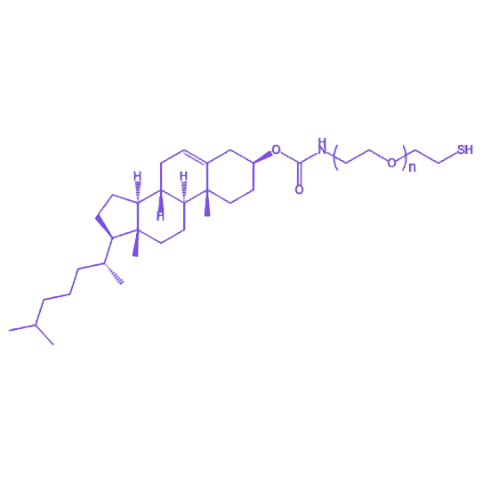 cholesterol-PEG-SH(胆固醇-聚乙二醇-巯基)是一种由胆固醇疏水端、聚乙二醇亲水链段及巯基活性官能团组成的功能性生物高分子材料,广泛应用于药物递送系统构建及生物分子偶联领域。其分子结构的多功能特性使其在生物医学工程领域展现出独特的应用价值。