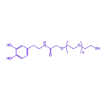 SH-PEG-DA(巯基-聚乙二醇-多巴胺)是一种通过化学偶联制备的功能性生物材料,其分子结构同时整合了巯基(-SH)与多巴胺(DA)双活性基团,在生物医用领域展现出独特的界面修饰与生物功能调控潜力。该产品兼具聚乙二醇(PEG)的生物相容性与双官能团的反应活性,为材料表面功能化及生物分子偶联提供高效解决方案。