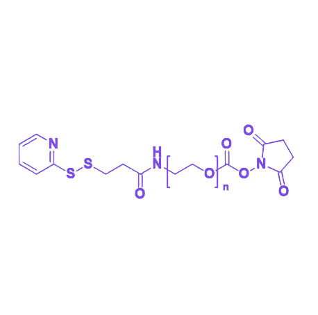 该化合物分子结构由三部分构成:亲水性聚乙二醇(PEG)主链作为柔性间隔臂,一端连接< strong >邻吡啶基二硫化物(OPSS)基团,可通过二硫键交换反应特异性结合含巯基(-SH)的生物分子;另一端修饰< strong >N-羟基丁二酰亚胺(NHS)活化酯,能与伯胺基团(-NH₂)发生高效酰胺化反应。其典型分子量范围为1000-20000 Da,在水及常用有机溶剂中具有良好溶解性,化学稳定性优异,可在温和条件下实现可控偶联。在生物医学领域,该试剂广泛应用于抗体-药物偶联物(ADC)制备、蛋白质PEG化修饰、纳米载体表面功能化及生物传感器构建等场景,通过灵活的双位点反应特性,有效提升目标分子的水溶性、靶向性及体内循环稳定性。