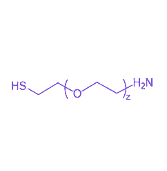 该化合物的分子结构以聚乙二醇(PEG)为主链,两端分别共价连接巯基与氨基官能团,形成线性AB型嵌段结构。其物化性质表现为良好的水溶性与生物相容性,在水溶液中呈现稳定的分子链舒展构象,可有效减少非特异性蛋白吸附。巯基基团能与金、银等金属表面形成稳定的硫金键,常用于纳米颗粒的表面功能化;氨基则可通过酰胺键、席夫碱等反应与羧酸、醛基等基团偶联,在药物递送系统中实现靶向分子的定点修饰。通过调节PEG分子量(如1k、2k、5k等常用规格),可灵活调控材料的空间位阻效应与生物分布特性,在生物医学工程领域具有广泛的应用前景。