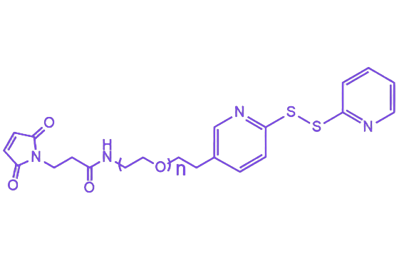 该化合物的分子结构以聚乙二醇(PEG)为主链,一端通过稳定的共价键连接马来酰亚胺基团(MAL),另一端修饰二巯基吡啶基团(OPSS)。这种独特的双活性位点设计赋予其在温和条件下(pH 6.5-7.5)高效偶联含巯基生物分子的能力,马来酰亚胺基团可特异性结合游离巯基形成稳定的硫醚键,而二巯基吡啶基团则能通过可逆的二硫键交换反应实现动态偶联。其物化性质表现为良好的水溶性与生物相容性,PEG链段的空间位阻效应可有效减少修饰后生物分子的免疫原性并提高其循环稳定性。在应用中,该衍生物广泛用于蛋白质、多肽、抗体及纳米药物载体的定点修饰,尤其适用于构建具有靶向递送功能的生物偶联物,在肿瘤治疗、分子诊断及生物材料表面功能化领域展现出显著优势。