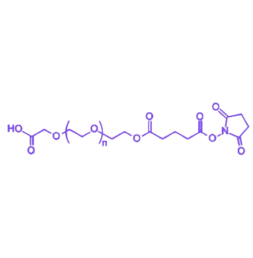 SG-PEG-COOH(琥珀酰亚胺戊二酸酯-聚乙二醇-羧基)是一种具有双官能团修饰的线性聚合物材料,其分子结构末端分别带有琥珀酰亚胺戊二酸酯(SG)活性基团与羧基(COOH),可作为生物偶联与药物递送系统中的关键连接子。该产品通过精确控制的PEG链长与官能团修饰度,实现了在水性体系中的优异分散性与生物相容性,为生物医药材料的功能化修饰提供高效解决方案。 SG-PEG-COOH的分子结构由三部分构成:一端为可与伯胺基团发生高效酰胺化反应的琥珀酰亚胺戊二酸酯活性酯,另一端为具有亲水性与化学反应位点的羧基,中间通过线性聚乙二醇(PEG)链段连接。这种独特的分子设计赋予材料双重反应活性,既能够通过SG基团快速偶联含氨基的生物分子(如抗体、多肽),又可通过羧基进行二次功能化修饰或表面固定。在物化性质方面,该产品表现出良好的水溶性与胶体稳定性,PEG链段的空间位阻效应可有效减少生物分子的非特异性吸附,而精确调控的分子量分布(常用范围1kDa-20kDa)则允许根据具体应用需求选择适配链长。在应用价值上,SG-PEG-COOH广泛用于靶向药物载体构建、纳米材料表面改性及生物传感器制备等领域,其生物相容性与低免疫原性的特性尤其适用于体内应用场景,通过共价偶联可显著改善药物分子的药代动力学性能或提升生物材料的界面生物活性。