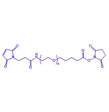 该化合物分子结构由聚乙二醇(PEG)主链、末端马来酰亚胺基团(Mal)和琥珀酰亚胺戊酸酯基团(SVA)构成,其中PEG链段具有良好的水溶性和生物相容性,可有效降低修饰后生物分子的免疫原性。马来酰亚胺基团能特异性地与巯基(-SH)发生Michael加成反应,而琥珀酰亚胺戊酸酯则对氨基(-NH₂)具有高反应活性,这种双功能基团协同作用使该衍生物可在温和条件下实现对含巯基和氨基生物分子的定向偶联。其平均分子量分布窄,化学纯度高,在水相缓冲体系中具有良好的稳定性,适用于蛋白质、多肽、抗体及纳米材料的定点修饰,广泛应用于药物递送系统构建、生物成像探针制备及生物传感器研发等领域。