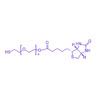该分子由 巯基(-SH)、聚乙二醇(PEG)链段和 生物素(Biotin) 三部分构成,其中巯基可通过硫醚键与含马来酰亚胺或卤代基团的生物分子高效偶联,生物素则能与链霉亲和素(Streptavidin)发生特异性相互作用,实现生物分子的定向固定或检测标记。聚乙二醇链段的引入可显著提升修饰后生物分子的水溶性、稳定性及循环半衰期,有效降低免疫原性。产品在水溶液中呈现良好的分散性,其分子量可根据需求定制调控,广泛应用于蛋白质/多肽修饰、纳米载药系统表面功能化、生物传感器构建及靶向诊断试剂开发等领域,尤其适用于需要兼具化学偶联活性与生物特异性识别功能的前沿生物技术研究。