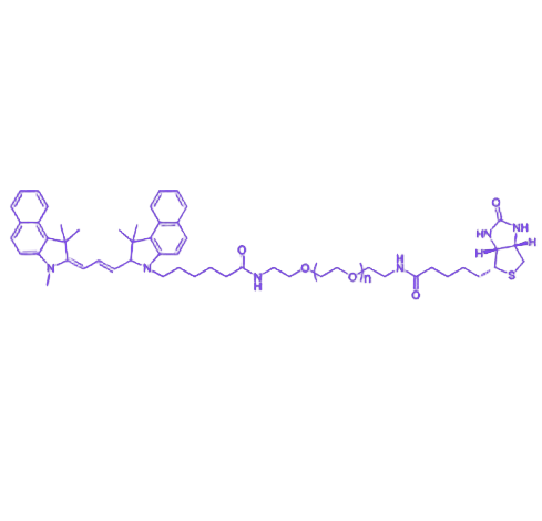 Cy3.5-PEG-Biotin是一种由花菁染料Cy3.5、聚乙二醇(PEG)链段与生物素(Biotin)基团通过化学偶联形成的多功能生物共轭探针,兼具荧光标记、生物靶向与水溶性调节等复合功能,广泛适用于生物分子示踪与检测领域。 该产品的分子结构以线性PEG链为连接桥,一端共价结合荧光发色团Cy3.5,另一端嫁接高亲和力的生物素基团,形成"荧光-链接臂-靶向"三段式分子架构。Cy3.5作为近红外荧光染料,具有斯托克斯位移大(约15-20 nm)、光稳定性优异及组织穿透深度较高的特性,其荧光发射波长通常位于670-690 nm区间,可有效降低生物样品自发荧光干扰;PEG链段的引入显著提升了探针的水溶性与生物相容性,减少非特异性结合,同时通过调节PEG分子量(常用范围500-10000 Da)可灵活调控探针的空间位阻与体内循环时间;末端的生物素基团能与链霉亲和素发生特异性、高亲和力相互作用(解离常数Kd≈10⁻¹⁵ M),实现目标生物分子的精准识别与富集。在应用场景中,该探针可通过生物素-亲和素系统介导,对抗体、核酸、细胞表面受体等生物靶点进行荧光标记,适用于荧光成像、流式细胞术、Western blot及生物传感器等实验技术,为生命科学研究提供高灵敏度的可视化检测工具。