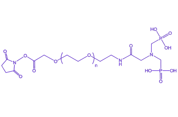 该产品分子结构以线性PEG为主链,一端修饰双磷酸基团(-PO(OH)₂),另一端共价连接NHS活性酯基团。双磷酸基团赋予分子对羟基磷灰石等矿化表面的特异性吸附能力,而NHS酯可在温和条件下与伯胺基团(-NH₂)快速发生酰胺化反应,实现与蛋白质、多肽等生物分子的定向偶联。PEG链段的引入有效改善了分子的水溶性与生物相容性,降低非特异性结合,同时通过调节PEG分子量可灵活调控偶联物的空间位阻与体内循环特性。在应用中,该试剂可作为骨靶向药物载体的关键偶联单元,通过双磷酸基团的高亲和力实现药物在骨组织的富集,或用于制备兼具靶向识别与生物活性的功能化纳米材料,在骨科疾病治疗、生物成像及组织工程领域具有重要应用价值。