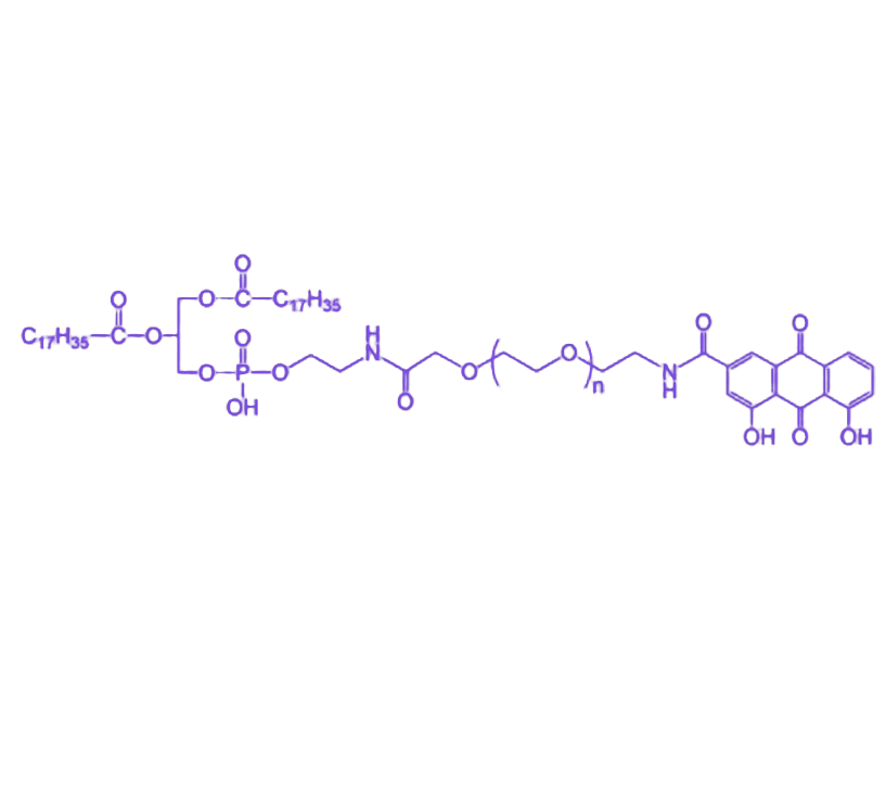 DSPE-PEG-Rhein(二硬脂酰磷脂酰乙酰胺-聚乙二醇-大黄酸)是一种由磷脂、聚乙二醇链与大黄酸基团共价偶联形成的功能性生物材料。该复合物兼具生物相容性与靶向活性,在药物递送系统领域展现出独特的应用潜力。 该产品的分子结构以1,2-二硬脂酰-sn-甘油-3-磷酸乙醇胺(DSPE)作为脂质锚定端,通过聚乙二醇(PEG)柔性链段连接具有生物活性的大黄酸基团,形成"脂质-亲水间隔臂-活性分子"的三嵌段结构。其物化特性表现为两亲性分子特征,在水溶液中可自组装形成稳定的纳米粒结构,动态光散射法测得的平均粒径通常分布在50-200 nm范围,zeta电位呈负电性。聚乙二醇链段的引入有效提升了材料的亲水性与空间位阻效应,显著降低了纳米载体的非特异性蛋白吸附;而大黄酸基团不仅赋予材料抗炎、抗氧化的生物活性,还可通过与特定受体的相互作用实现靶向递送功能,这种"载体-活性分子"一体化设计为构建多功能药物递送系统提供了高效解决方案。