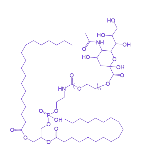 该产品分子结构由三部分构成:疏水端为二硬脂酰磷脂酰乙酰胺(DSPE),赋予其插入细胞膜或脂质体的能力;中间连接臂为**聚乙二醇(PEG)** 链段,可有效改善材料的亲水性、生物相容性及循环稳定性;终端修饰的**唾液酸(SA)** 基团作为生物识别位点,能够特异性识别细胞表面的唾液酸受体,从而介导主动靶向递送。其物化性质表现为良好的两亲性,可通过薄膜分散法、乳化法等工艺制备成纳米载体,在水性体系中呈现稳定的胶体分散状态。在应用层面,该偶联物可通过修饰脂质体、纳米粒等载体表面,显著提升药物递送系统的靶向性和生物利用度,在肿瘤治疗、炎症性疾病干预等领域具有重要的研究价值和转化前景。