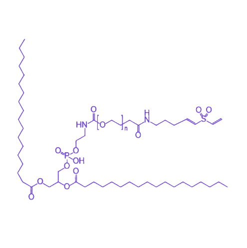 该化合物的分子结构以DSPE作为疏水锚定端,可通过插入作用稳定整合于脂质体或细胞膜结构中;中间PEG链段赋予分子良好的水溶性与空间位阻效应,能有效减少非特异性蛋白吸附;末端的乙烯砜基团则具备优异的生物正交反应活性,可在温和条件下与含巯基的生物分子(如抗体、肽段)发生特异性Michael加成反应,实现高效共价偶联。其物化性质表现为在水相体系中可自组装形成稳定的胶束或脂质体结构,PEG分子量可根据需求灵活调控(常规范围500-10000 Da),产品通常为白色粉末状固体,易溶于氯仿、甲醇等有机溶剂,在中性缓冲液中具有良好分散性。这种结构特性使其在靶向药物递送系统构建中展现突出优势,可通过修饰靶向配体实现药物的精准递送,同时PEG链的存在能延长循环半衰期,降低免疫原性,在肿瘤治疗、分子成像及生物材料表面功能化等研究领域具有广泛的应用前景。