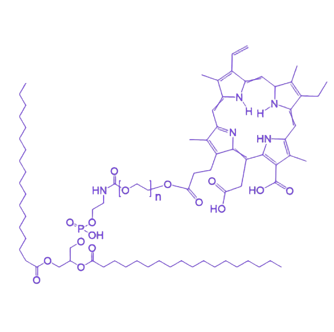 该产品的分子结构以PEG化磷脂为基础骨架,通过醚键或酰胺键将Ce6共价连接于PEG末端,形成具有明确两亲性的线性分子结构。其理化性质表现为良好的水溶性与生物相容性,在水性介质中可自组装形成稳定的纳米胶束或脂质体结构,平均粒径通常分布在50-200 nm范围。作为光动力治疗的关键组件,Ce6在特定波长(650-670 nm)光照下能够高效产生活性氧(ROS),诱导肿瘤细胞凋亡;同时PEG修饰可显著延长血液循环时间,减少网状内皮系统清除,提升肿瘤组织的被动靶向富集效率。该材料适用于构建集诊断、靶向递送与光疗于一体的多功能纳米药物平台,在肿瘤精准治疗、光免疫治疗等前沿领域展现出重要研究价值。